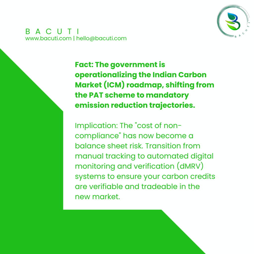 The government is operationalizing the Indian Carbon Market (ICM) roadmap, shifting from the PAT scheme to mandatory emission reduction trajectories.